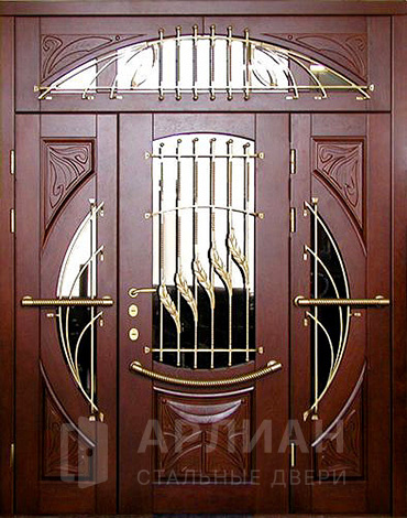 Двухстворчатая входная дверь со стеклом и ковкой №9