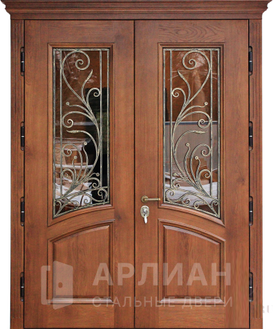 Входная арочная дверь с витражом и решеткой №419